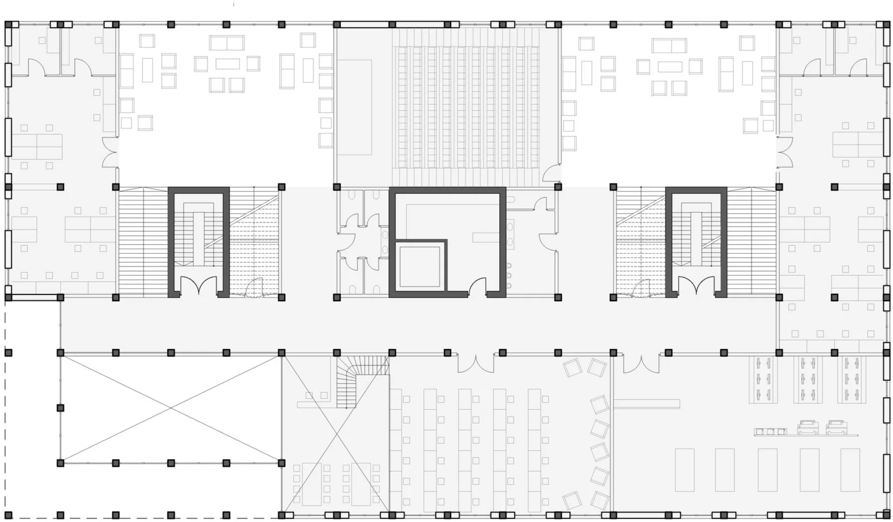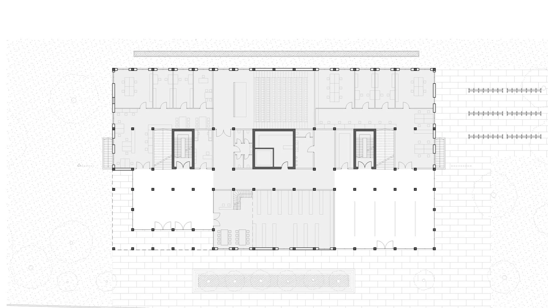 To ensure that communal spaces are inviting and possess a tangible spatial quality, the layout follows a staggered arrangement where social spaces shift from one facade to another as the floors ascend. This organizational scheme guided the room distribution, placing primary functions such as seminar rooms, workshops, and the library directly adjacent to the facade, while internal corridors facilitate circulation along the building‘s longitudinal axis.