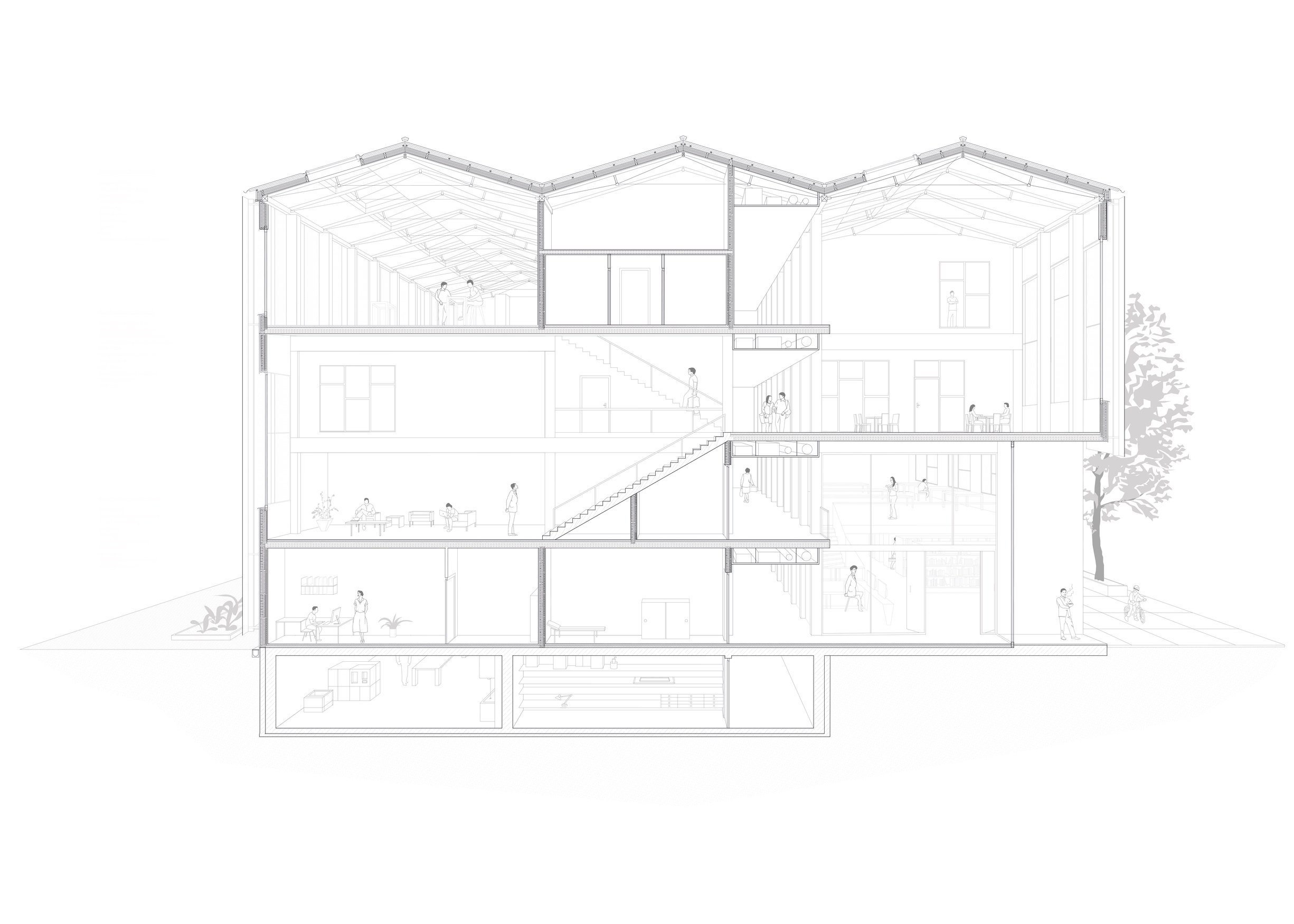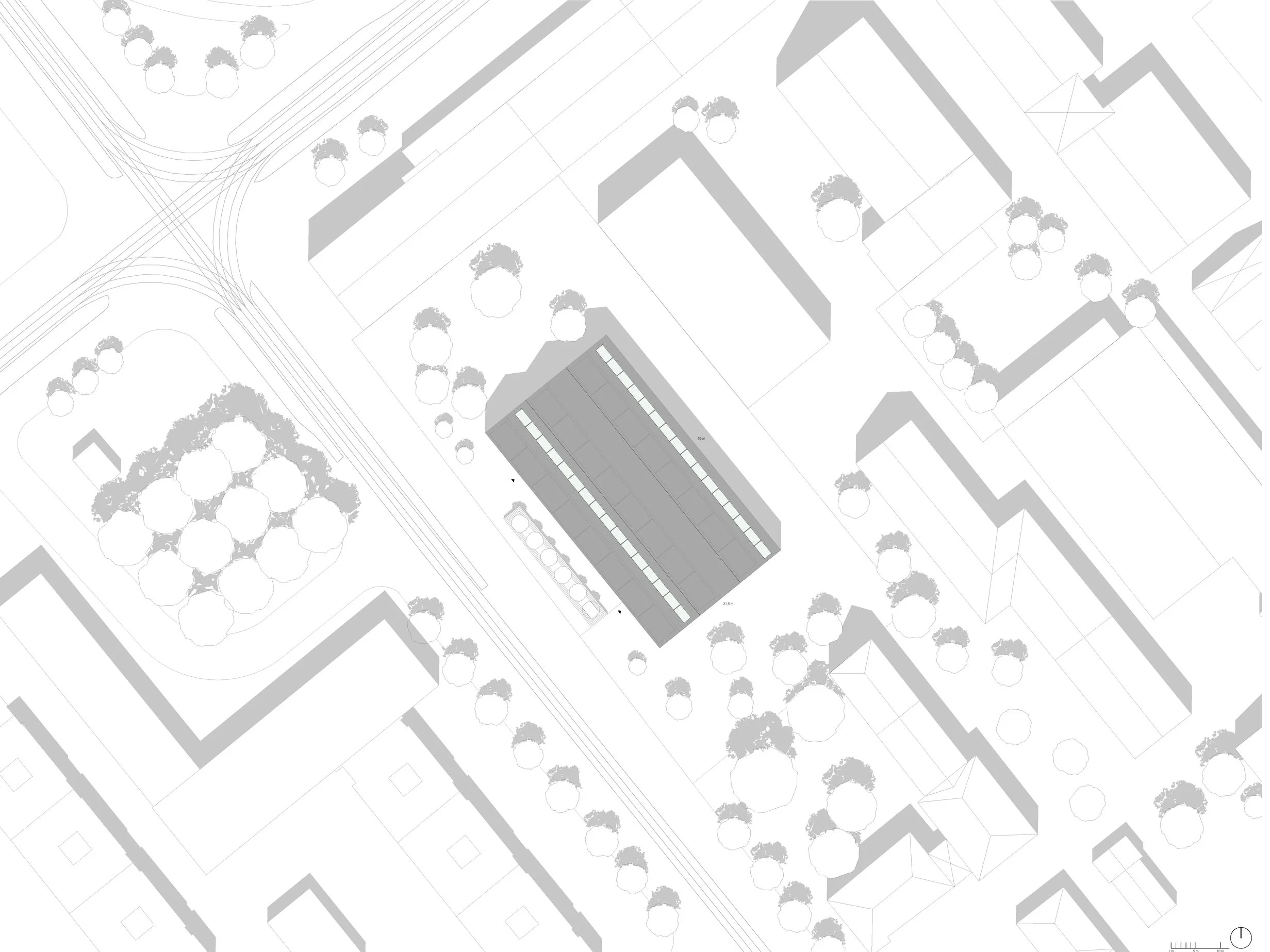A key focus of this institute is the human experience and the interaction among visitors. The objective of fostering a sense of community starts externally, where the entrance is oriented towards the tram station to the northwest, naturally inviting people into the building. Internally, we designed a circulation system that „connects people“ by leading them through a common double-height space, flooded with natural light, at every staircase landing. This approach disrupts the linear movement from one point to another, encouraging social interaction and promoting a slower, more deliberate circulation pace, counteracting the rapid rhythms of daily routines. We have termed this approach „disruptive circulation.“