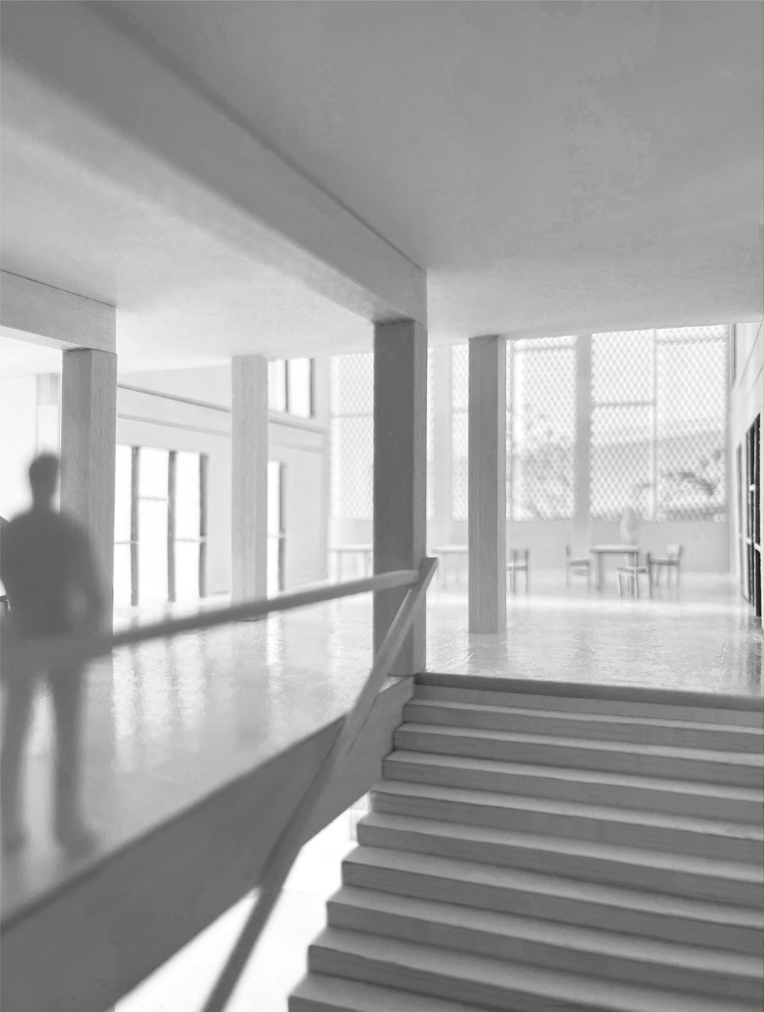Interior image, stairway leading to common space